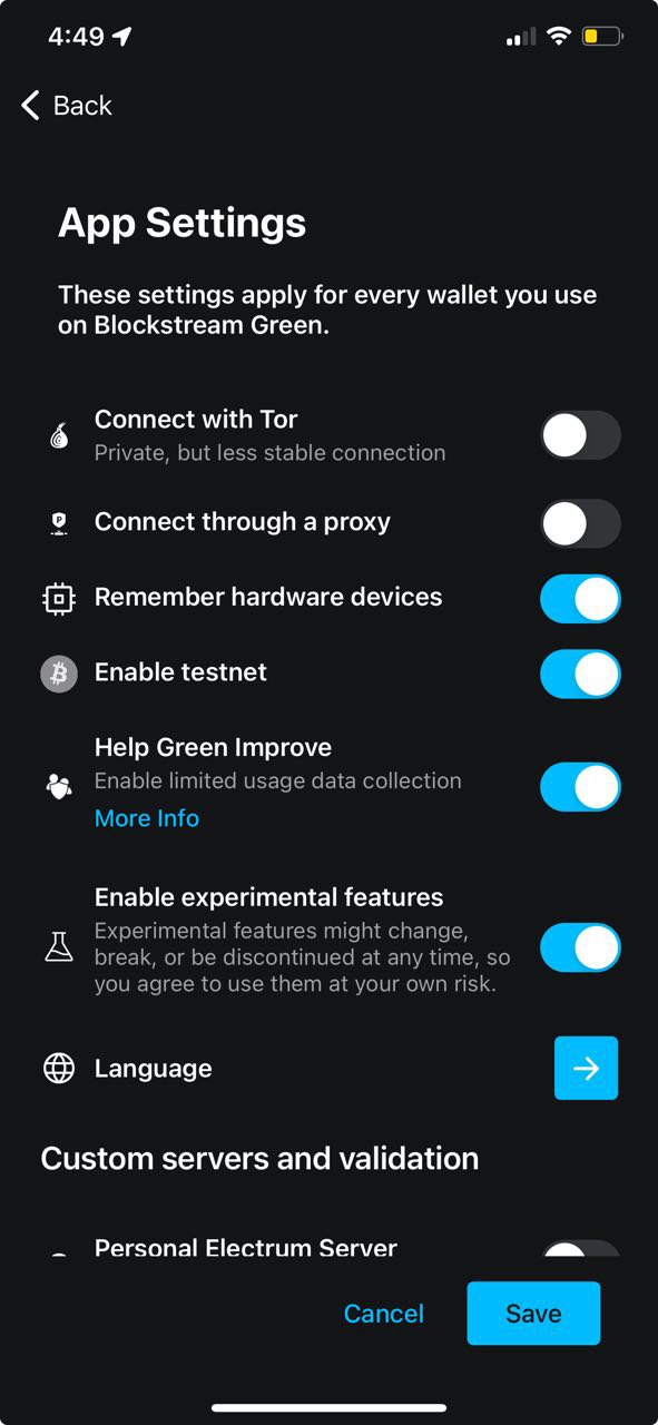 On the next screen, tap the icon with the three dots in the top-right corner. This will bring up the App Settings screen where you can enable testnet. After turning on the Enable testnet toggle, tap Save.