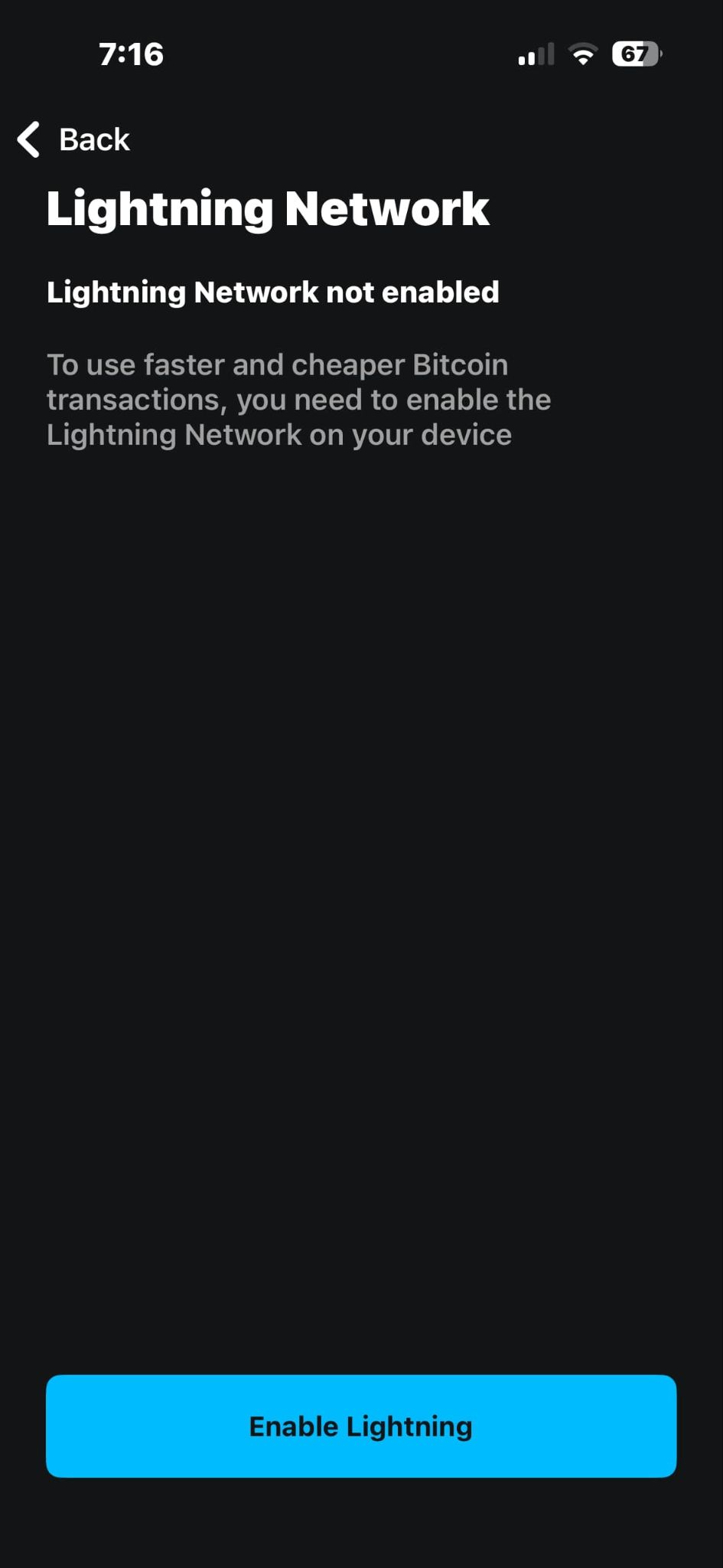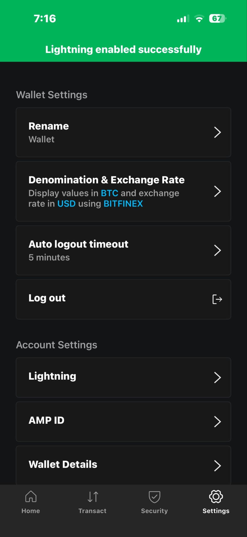 You should see a green Lightning enabled successfully confirmation at the top of your screen. Now you are free to start sending and receiving Lightning bitcoin with your wallet!