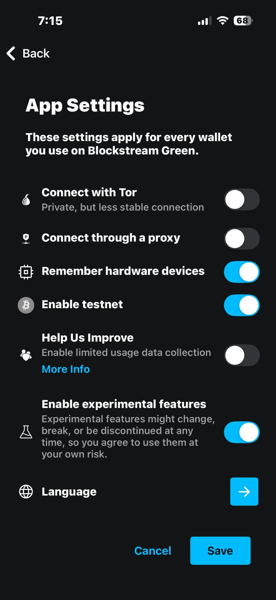 Lightning is currently an experimental feature in the Blockstream app. By enabling Lightning through Experimental Features, you have agreed to use them at your own risk. These features might change, break or be discontinued at any time.