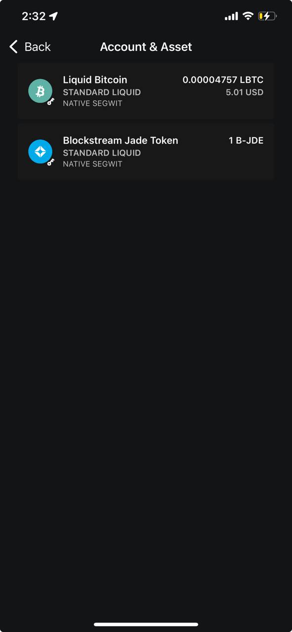 On the next screen, select the specific Liquid asset you would like to send. Then, select the amount of the token you would like to send.