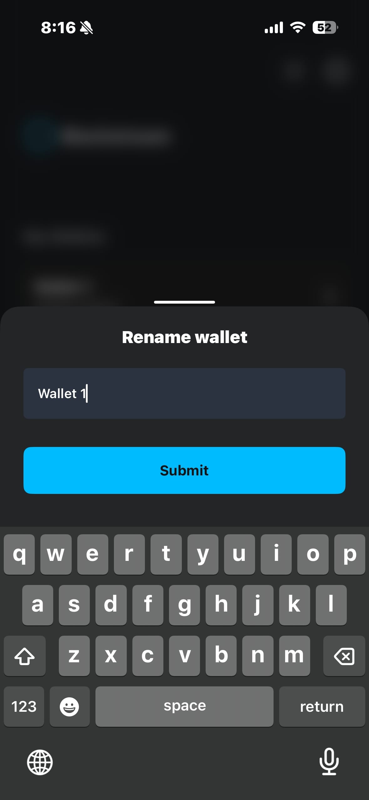 A pop-up window will appear where you can change your wallet name. Type your new wallet name in the provided text box and tap Submit to complete the process.