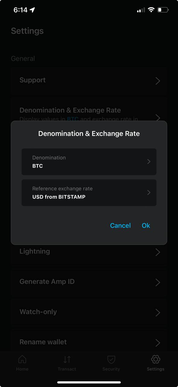 Note: The Denomination & Exchange Rate pop-up window is also where you can change the default denomination of bitcoin. Every bitcoin can be divided into 100 million satoshis (or sats), so you may prefer to view your balance in smaller denominations.