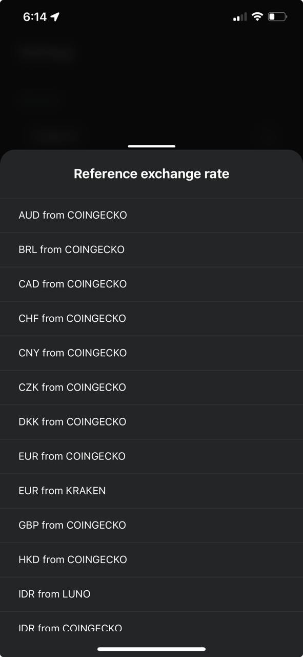 From the pop-up window, click Reference exchange rate and scroll through the options until you find your fiat currency and source exchange of choice. Then, tap Ok after making your selection.